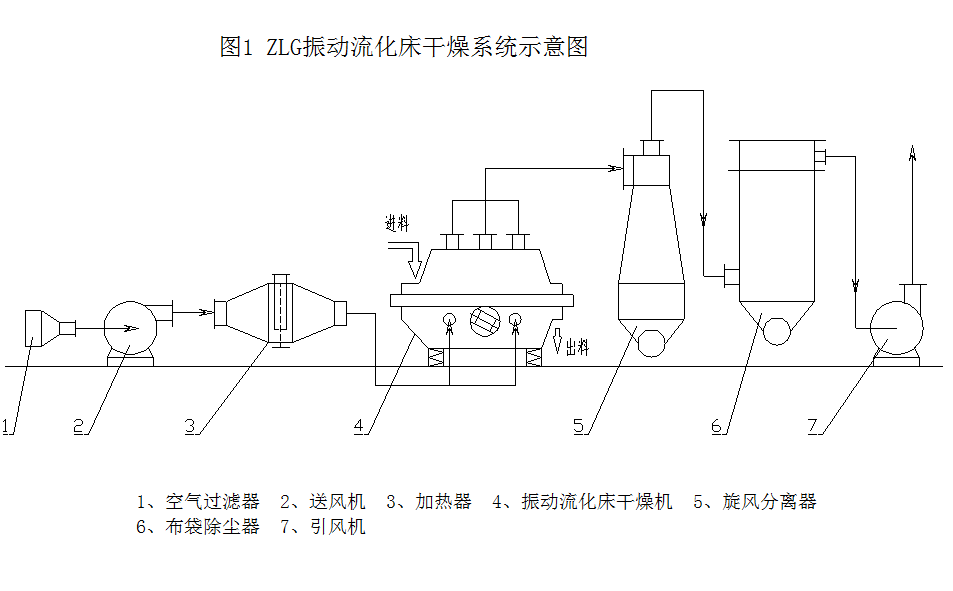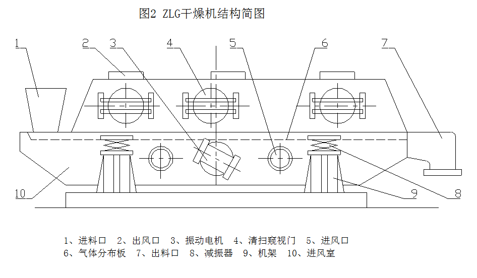 圖1是ZLG振動流化床干燥系統(tǒng)示意圖。ZLG是干燥系統(tǒng)的主體設(shè)備, 主要由以下幾部分組成: 1、進出風機構(gòu),包括進風口、進風室及氣體預分布器、氣體分布板及出風口);2、床體,包括上下箱體及之間軟連接, 兩端進出料口;3、振動機構(gòu),包括振動電機、減振器、機架等,見圖2。