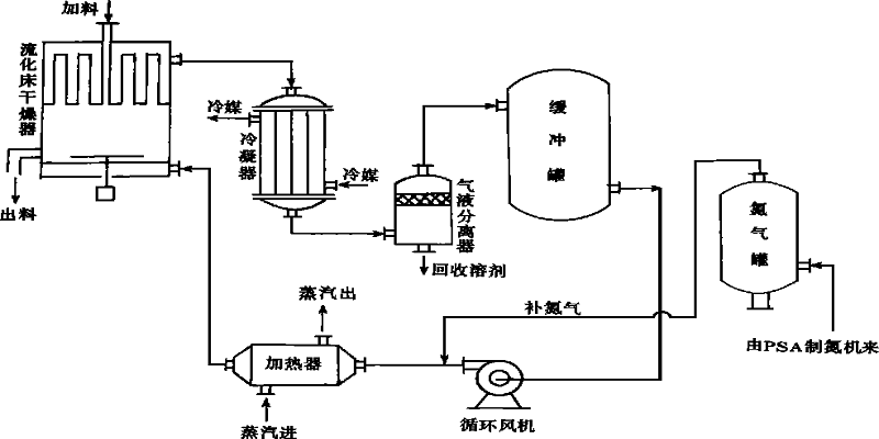 操作時物料通過加料器,定量加入帶攪拌的流化床干燥器中。在熱風(fēng)( 氮氣或空氣) 作用下,干燥器內(nèi)物料產(chǎn)生穩(wěn)定的流態(tài)化,并在熱風(fēng)與濕物料接觸中進行傳熱和傳質(zhì)。干燥過程中物料所含濕分不斷蒸發(fā)和分離,產(chǎn)品也隨之干燥至規(guī)定的含濕率。干燥操作中揚起的細粉由干燥室上部袋濾器捕集,并通過自動振打機構(gòu)定時迫使它脫離濾袋表面,重新回到干燥室料層。從濕物料中不斷蒸發(fā)的溶劑蒸氣隨氮氣帶出干燥器,并在后面的冷凝器中被凝結(jié)成液體而加以回收。已去除液體溶劑的干燥介質(zhì)經(jīng)加熱后重新循環(huán)使用。當(dāng)閉路系統(tǒng)發(fā)生泄漏或其他原因引起壓力變動時,由氮氣罐自動向閉路系統(tǒng)補充適量氮氣。氮氣消耗量一般為3∽5m3/ h。