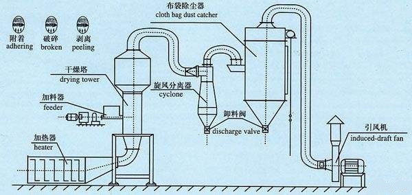 該工藝適合于染料、顏料、涂料、農(nóng)化、生化制品、豆?jié){(制粉)、腐植酸、中藥浸膏、農(nóng)藥、木質素、果膠酶等各種溶液、懸浮液、乳濁液,以及膏糊狀物料、稀漿狀、濾餅狀物料的干燥